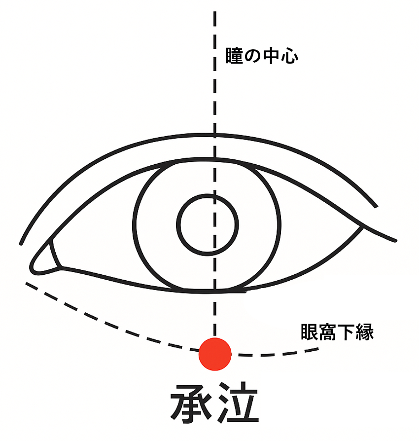 承泣(しょうきゅう)は顔面部にある経穴で、眼球と眼窩下縁の間、瞳孔線上に取ります。